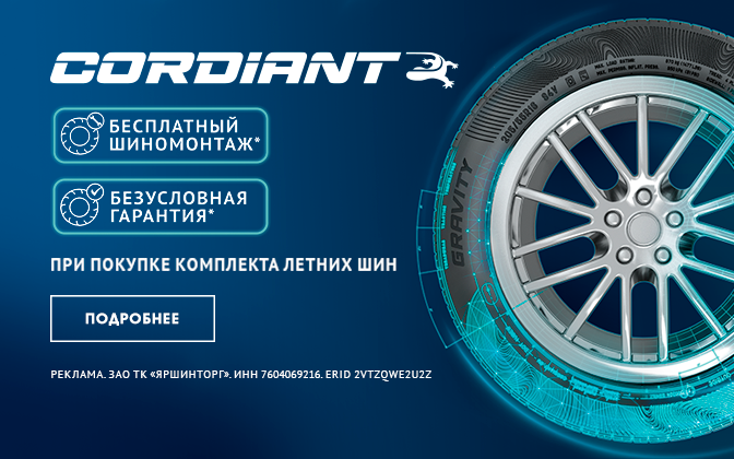 Программа на летние шины: Cordiant Run Tour, Cordiant Gravity, Cordiant Gravity SUV, Cordiant Off-Road 2, Cordiant Sport 3, Cordiant Road Runner, Cordiant Comfort 2, Cordiant All-Terrain, Cordiant Off-Road действует с 1 марта 2026 г. по 28 февраля 2027 г.